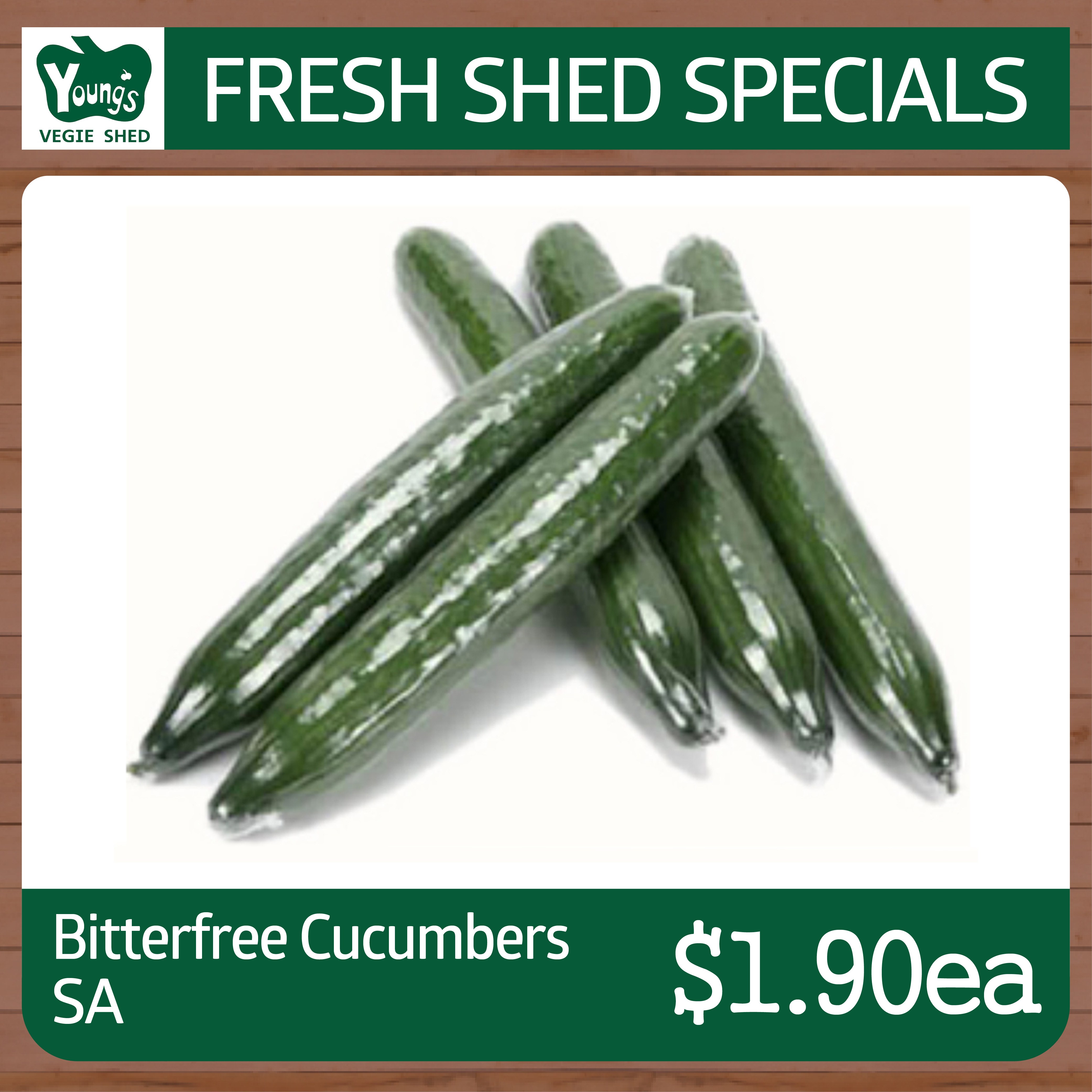 Pick up some Australian Bitter-free Cucumbers from Young's Vegie Shed for just $1.90 each.